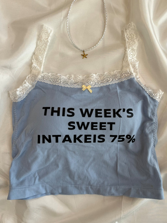 روی کراپتاپ نوشتهی بامزهی “THIS WEEK’S SWEET INTAKE IS 75%” چاپ شده که استایل خاص و بازیگوشی داره – درست مثل دخترایی که از زندگی لذت میبرن و همیشه یه لبخند گوشه لبشونه 🍭
